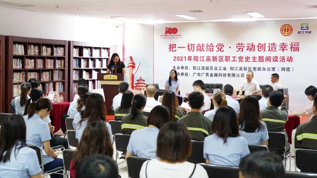 6月29日,由阳江高新区总工会、区党政办(网信)和广东广青金属科技有限公司工会联合举办的“把一切献给党•劳动创造幸福”阳江高新区职工党史主题阅读分享会在广青科技职工书屋举行,阳江高新区总工会主席阮广渊,公司党委副书记、工会主席王大庆以及职工代表参加了活动。