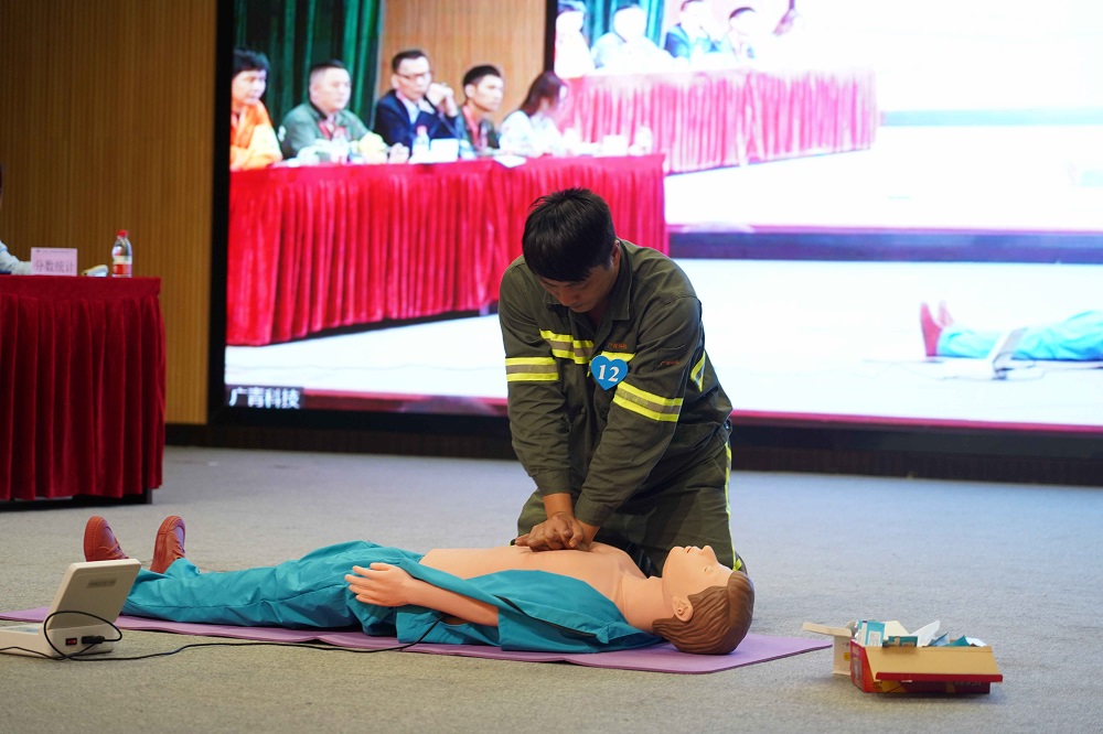 现场气氛热烈,比赛紧张而有序,参赛选手们精神饱满、沉着冷静,有序完成对环境进行评估、对患者意识判断、安置患者、胸外心脏按压、人工呼吸等各项操作指标,他们准备充足,操作娴熟,充分展现了参赛者紧急救护的风采。
