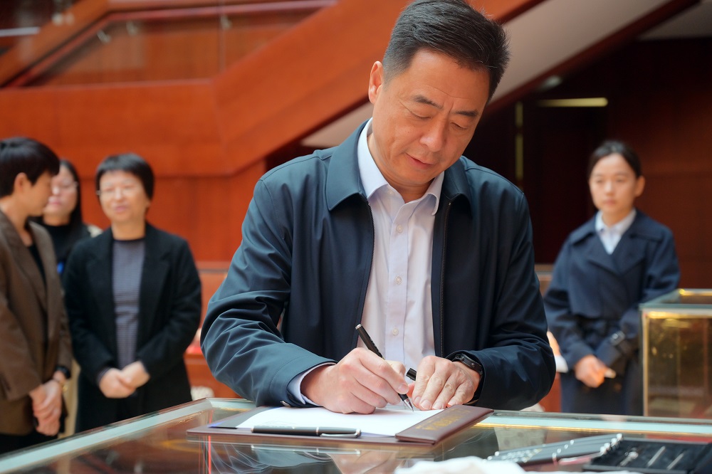 在供销大厅,周玉泉围绕青拓集团发展历程、湾坞半岛不锈钢产业园区布局、不锈钢工业技术创新以及QN系列等不锈钢产品进行详细介绍。王珩对青拓集团研发生产的“环保型笔尖钢”和“0.015毫米超薄手撕钢”颇感兴趣,并亲自上手体验。