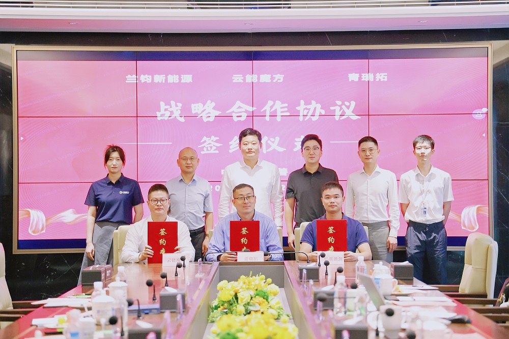 近日,兰钧新能源科技有限公司与苏州云能魔方能源科技有限公司、上海青瑞拓新能源科技有限公司在嘉善基地举行三方战略合作签约仪式,永青科技集团副总裁、兰钧新能源董事长冯挺,云能魔方董事长张建兴及青瑞拓董事长杨立勇等相关领导出席见证本次签约仪式。兰钧新能源研究院院长黄海宁、云能魔方总经理胡东斌及青瑞拓副总经理杨宝林分别代表三方在合作协议书上签字。