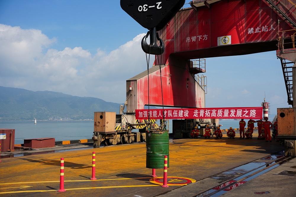 门座式起重机项目的选手们在离地面20米的操作室里,操作门机长臂,吊起铁桶,水平移动,绕障,最终到达指定点位,这一系列高难度的操作,有效检验了参赛职工们的技能素质和安全操作水平。